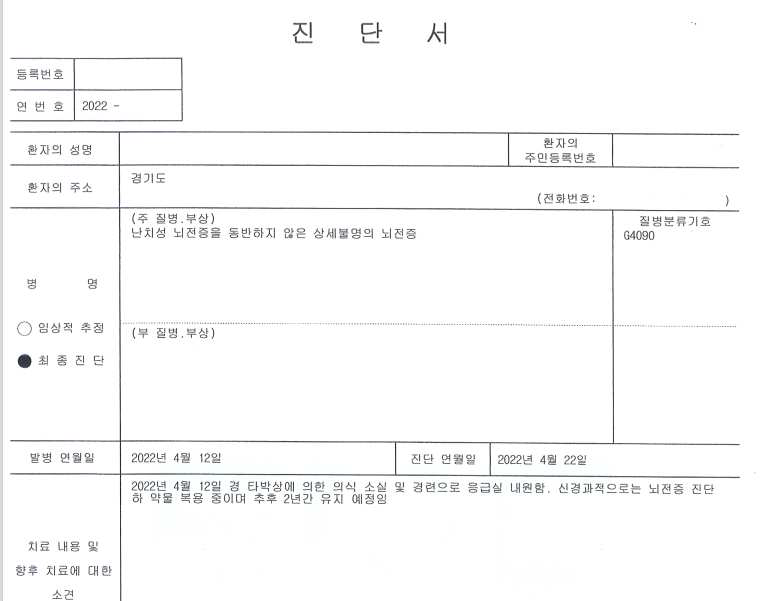 최초 진단은 뇌전증, 대뇌 타박상 >>>>>>
